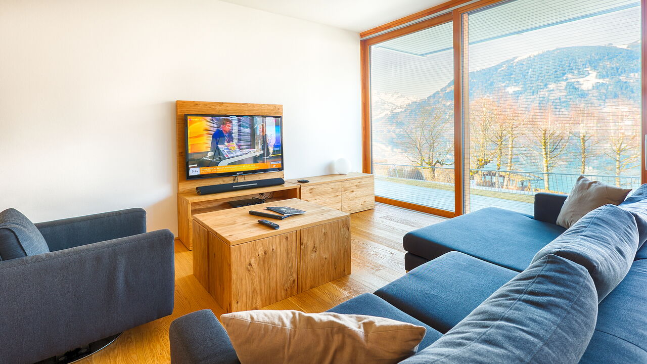 This beautiful flat is located on the ground floor of the Bellevue residence and has a terrace with garden. There are two bedrooms with double beds and a single sofa bed each, as well as a further room with a bunk bed (width approx. 70 cm x length approx. 157 cm), which is ideal for two smaller children. The flat can therefore accommodate up to 8 people. The spacious living room has a large dining table, an open-plan designer kitchen and a comfortable seating area. Two bathrooms with shower and WC complete the offer.